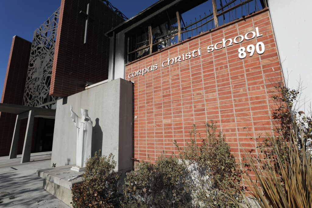 A burned section of Corpus Christi School is seen in Pacific Palisades.