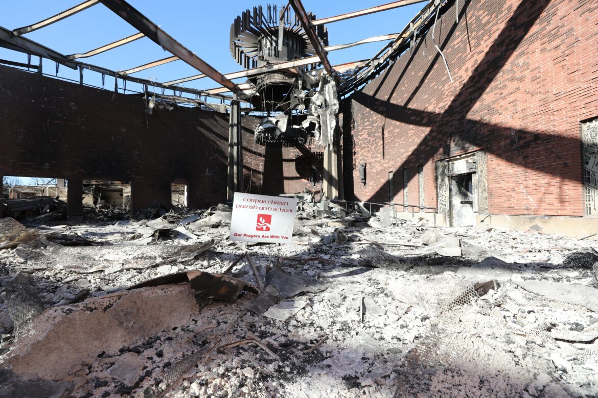 The inside of the destroyed Corpus Christi Church is seen in Pacific Palisades on the west side of Los Angeles Jan. 15, 2025, in the aftermath of the wildfires. As of late Jan. 14, the death toll numbered at least 25 people, but with several wildfires raging, officials warn the actual toll will remain unclear until it's safe for investigators to access neighborhoods. Tens of thousands of people have been impacted by evacuation orders since the blazes began Jan. 7. (OSV News photo/Bob Roller)