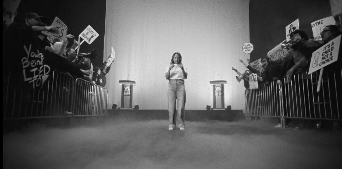 This is how a new ad, widely shared on social media as a Super Bowl ad, begins. The camera follows the young woman as she’s transported into a black-and-white world where two mobs scream at each other from behind the metal fences that separate them. To her right, abortion supporters shout, “My body, my choice!” On her left, pro-lifers yell back, “Choose life!”