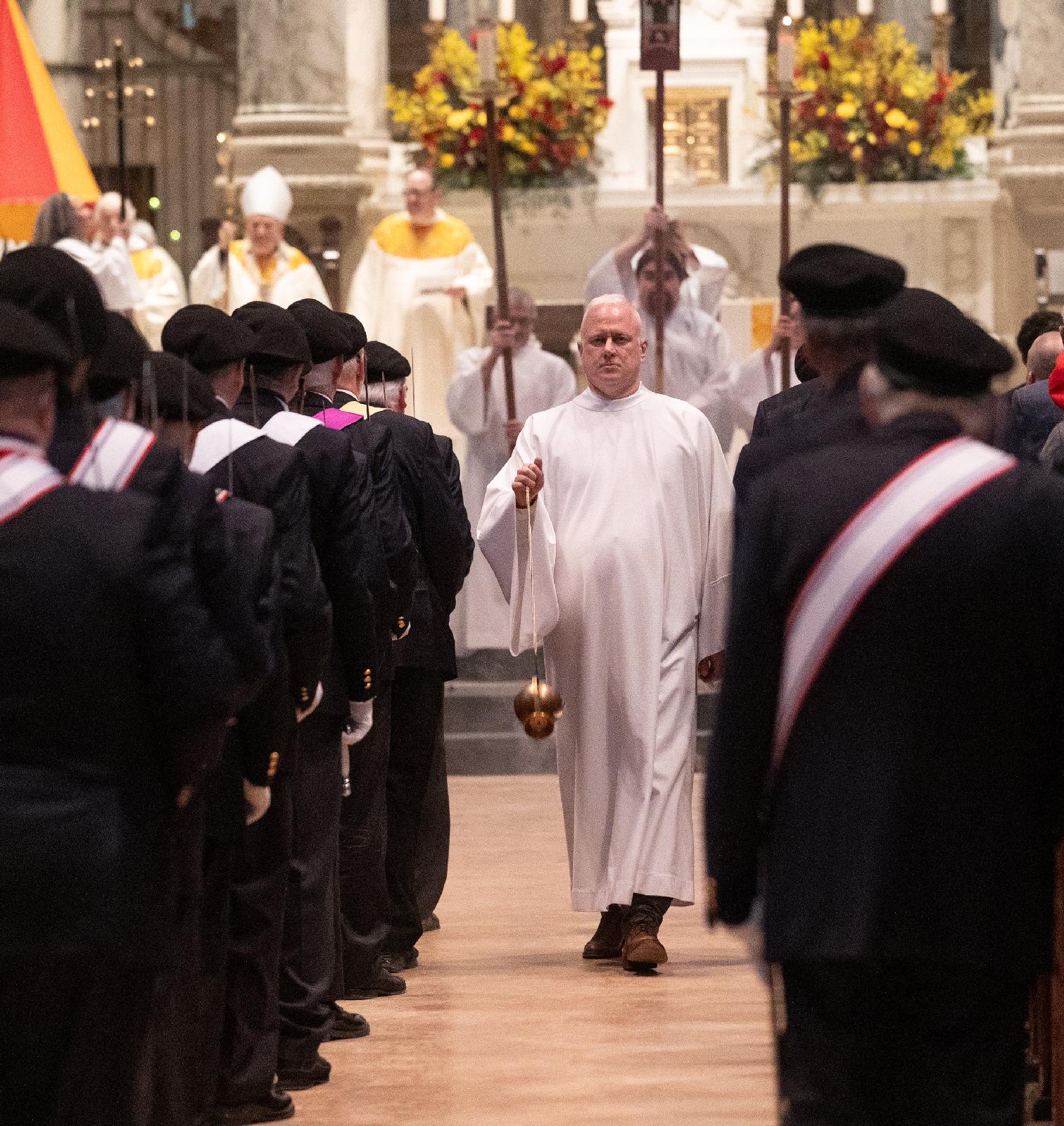 Carried in the procession was one of the marks of a basilica — a red and yellow paneled silk “ombrellino,” or small umbrella, that normally stands partially open in the Basilica of St. Mary’s sanctuary. A symbol of a basilica dating to the Middle Ages, the ombrellino would be opened fully to protect a pope from the elements were a pope to visit the basilica.