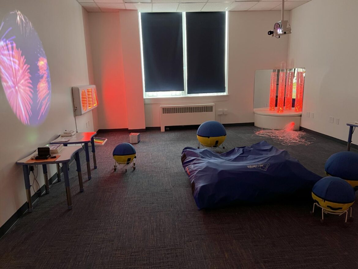 Installed in a quiet, second-floor area of the school, the new sensory room is filled with specialized visual, auditory and tactile equipment designed to help students self-regulate, manage anxiety and build coping skills.