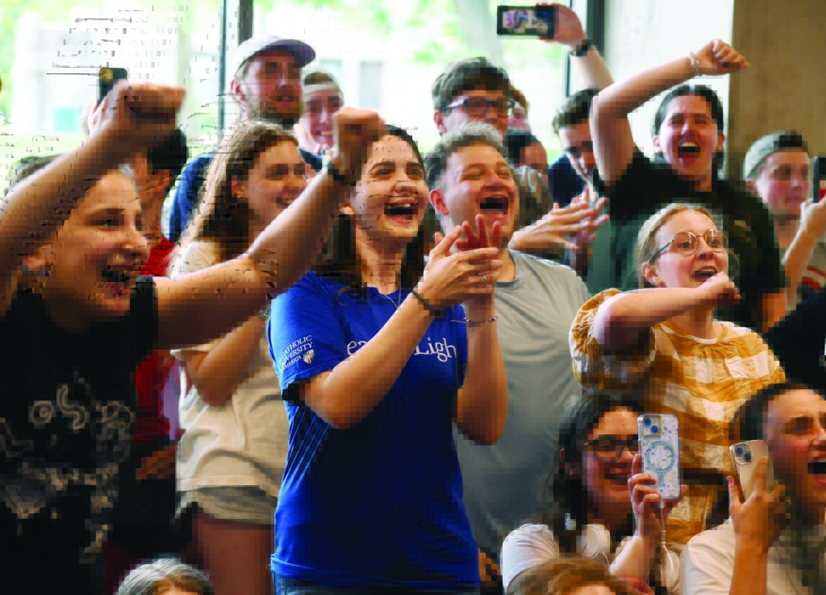 At The Catholic University of America next door to the basilica, students were watching the jumbo TV screens at Murphy’s Pub on campus. They cheered and then listened with rapt attention as the new Pope Leo XIV appeared for the first time.