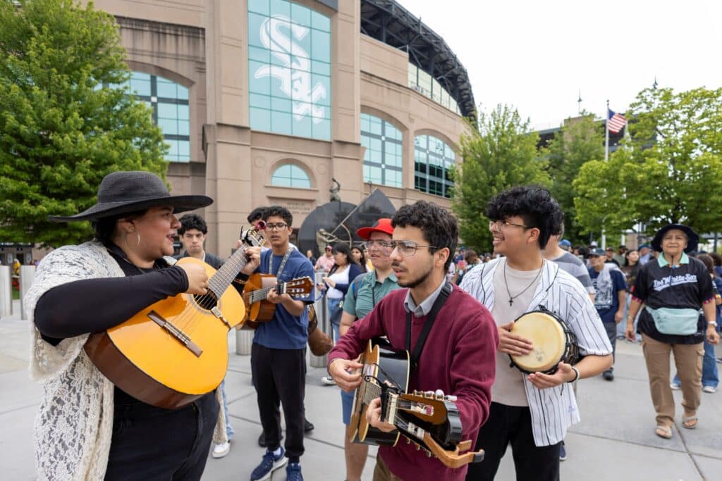 People sing and play music ahead of a June 14, 2025, Mass in honor of Pope Leo XIV at Rate Field in Chicago. (OSV News photo/Carlos Osorio, Reuters)