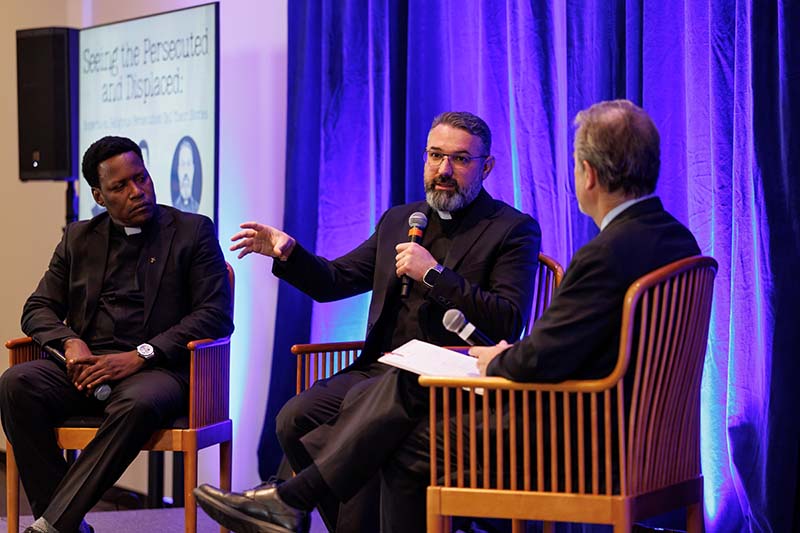 Rasche made his comments while leading a panel, “Seeing the Persecuted and Displaced: Experts Tell Their Stories,” held Dec. 2 at the shrine. Dozens of people gathered to hear him and other experts in religious persecution speak during the discussion that launched the exhibit. Two experts joined Rasche: Father Athanasius Barkindo, executive director of the National Peace Committee in Abuja, Nigeria, and of the Kukah Center in Abuja, and Father Karam Shamasha, provost of the Catholic University in Erbil, Iraq.