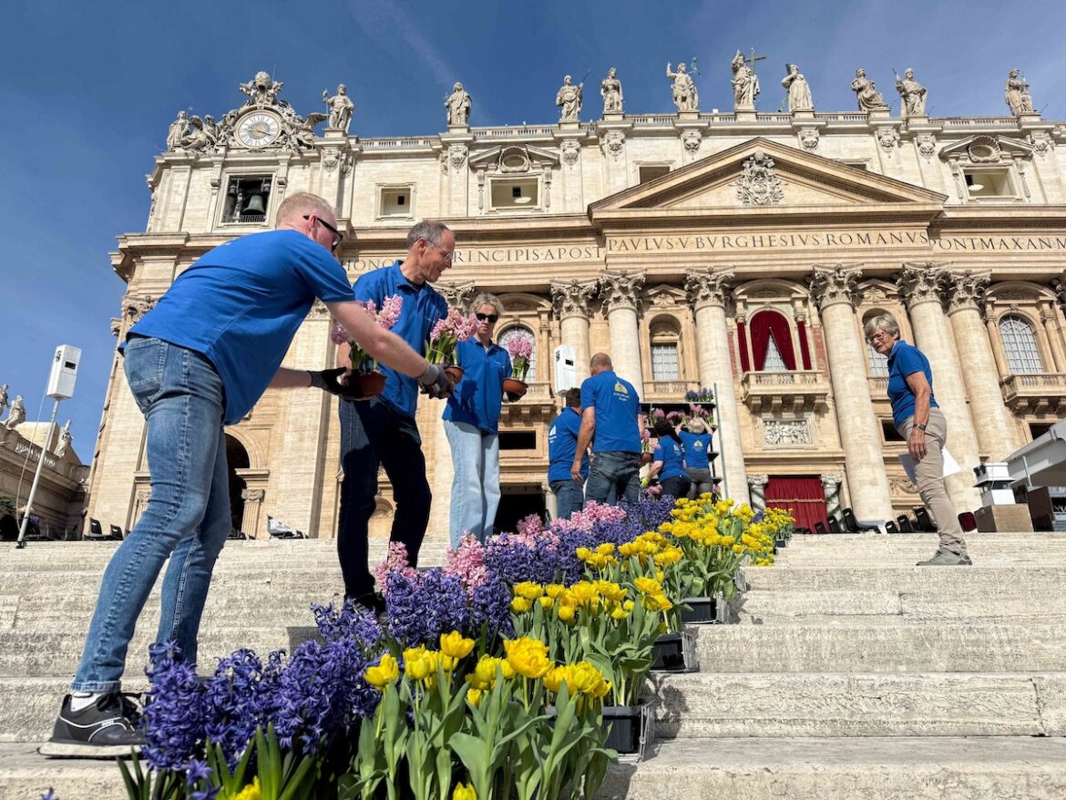 On Easter day, there is a true “explosion of flowers,” representing new life and “light,” which means the predominant colors should be yellow and white, she said. All the other colored blossoms and plants are there “to give the idea of a garden, the garden of the Resurrection,” she said.