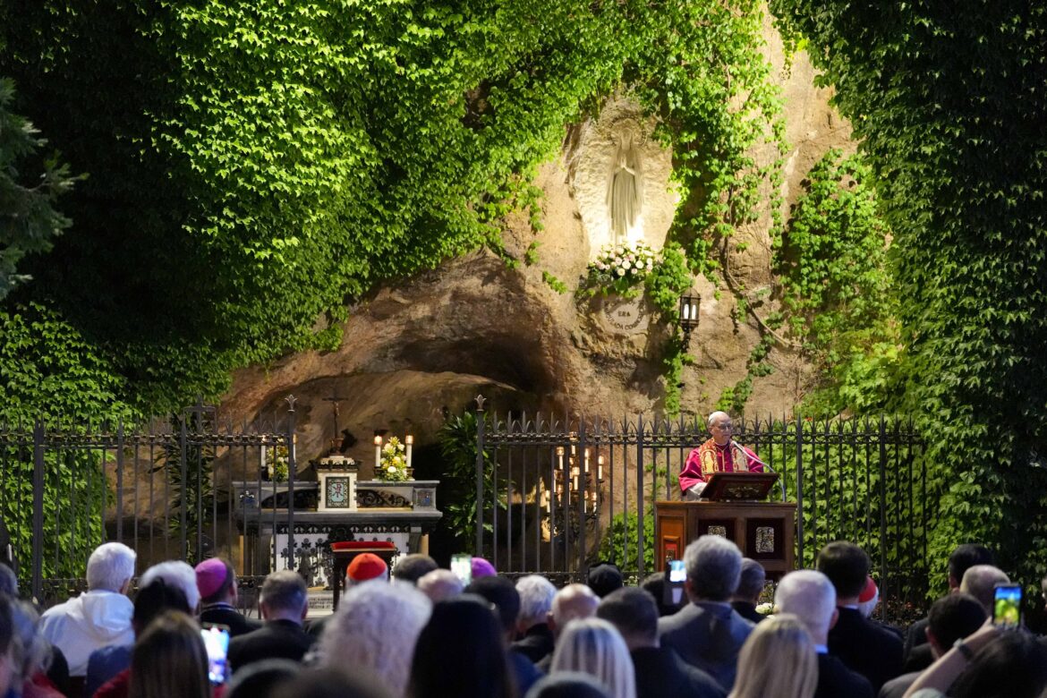 At the top of the Vatican hill, at the ivy-covered replica of the grotto at Lourdes, France, they were joined by Pope Leo XIV.