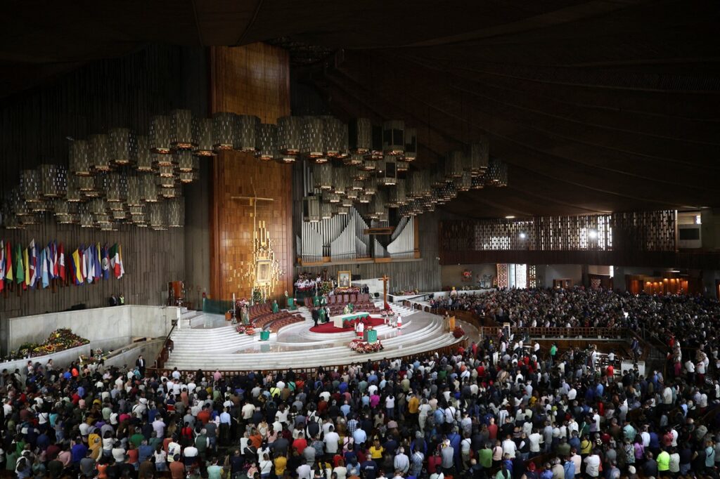 “Tell me what you see,” she asks of those guiding her and then can quickly sketch out a mental map of places visitors should take note of inside and around the basilica. A little bit to the left, near the entrance, there’s a bent crucifix, she narrates, damaged in 1921 after a bomb went off near the cloak that bears the image of Our Lady of Guadalupe. Outside the basilica, she points out how part of the belltower, via animation, retells the story each hour on the hour of how, in 1531, Our Lady of Guadalupe is said to have appeared to St. Juan Diego on a nearby hill, later producing her image on his cloak.
