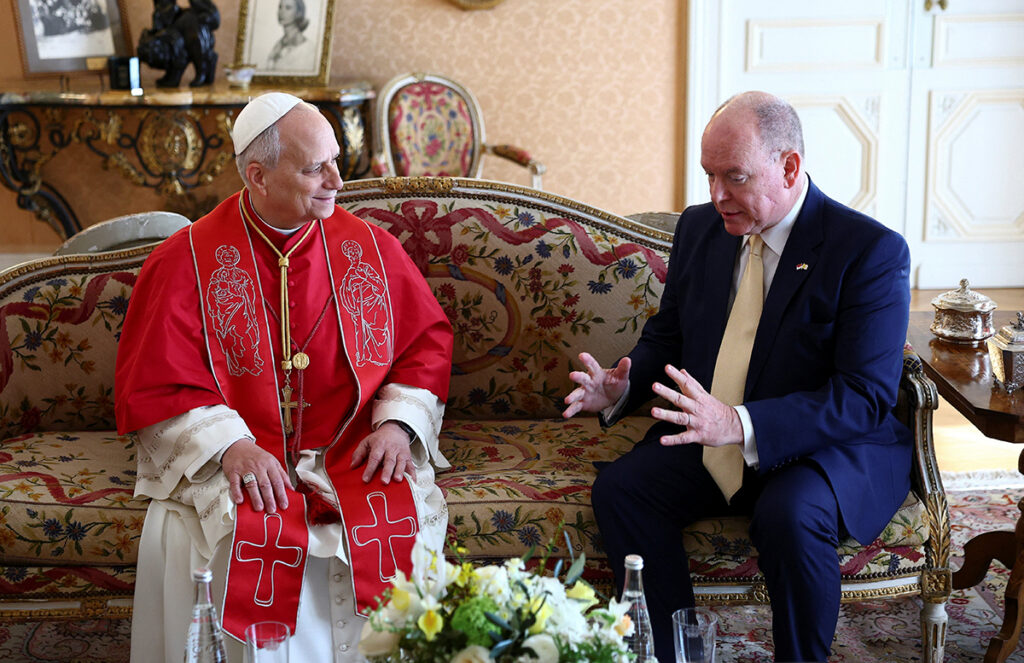Pope Leo XIV meets with Prince Albert II of Monaco during a private meeting at the Prince’s Palace March 28, 2026. It is Pope Leo’s first international journey of 2026 and only the second of his pontificate. (OSV News photo/Guglielmo Mangiapane, a pool via Reuters)