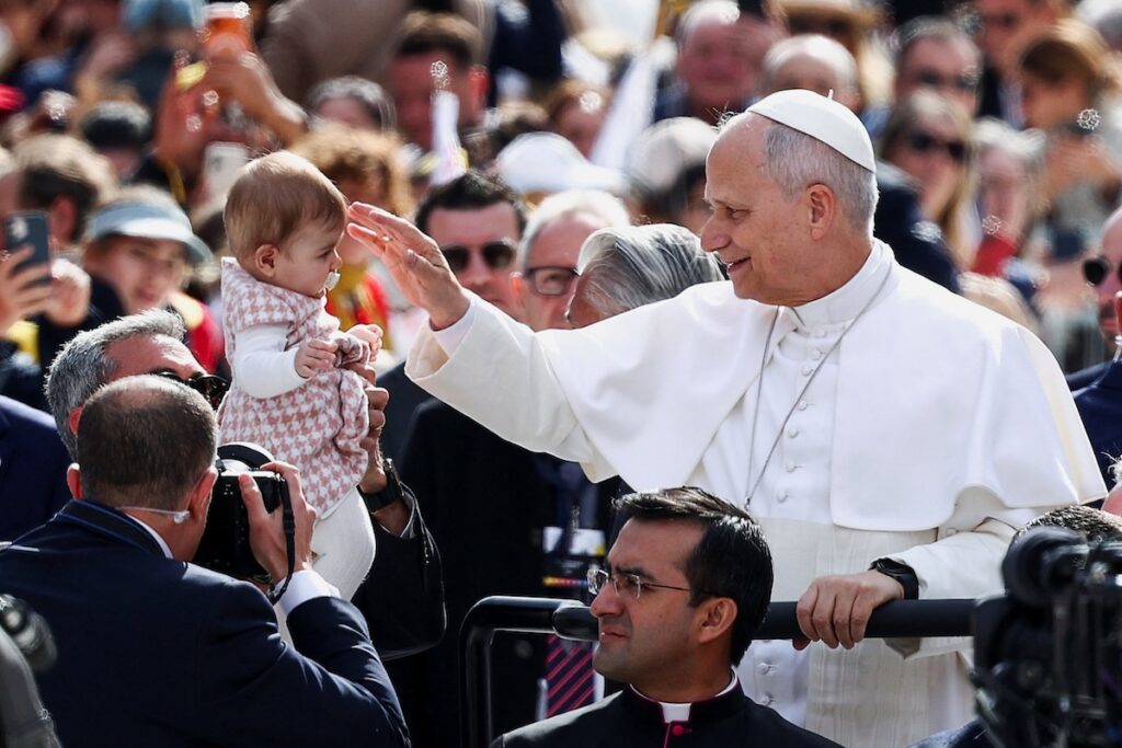 Pope Leo XIV blesses a baby as he arrives to celebrate a public Mass at the Louis II Stadium as part of a one-day trip in Monaco, March 28, 2026. (OSV News photo/Guglielmo Mangiapane, Reuters)
