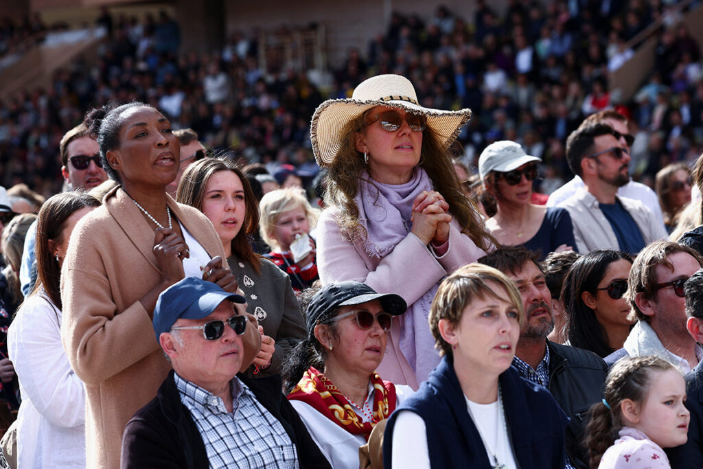 People look on as Pope Leo XIV celebrates Mass at Louis II Stadium as part of a one-day apostolic trip in Monaco, March 28, 2026. It is Pope Leo’s first international journey of 2026 and only the second of his pontificate. (OSV News photo/Guglielmo Mangiapane, Reuters)