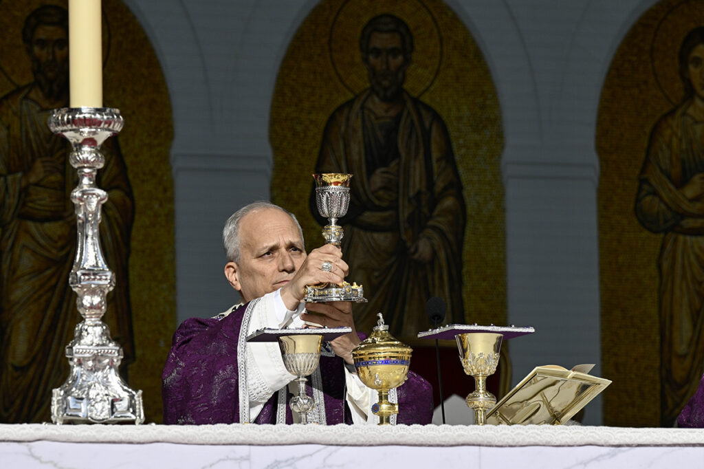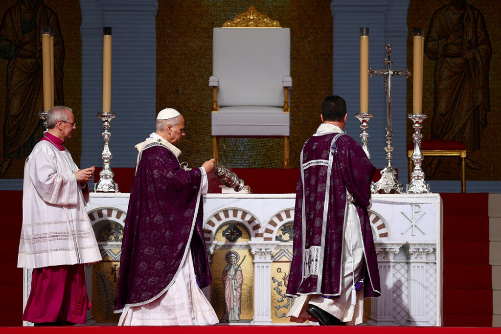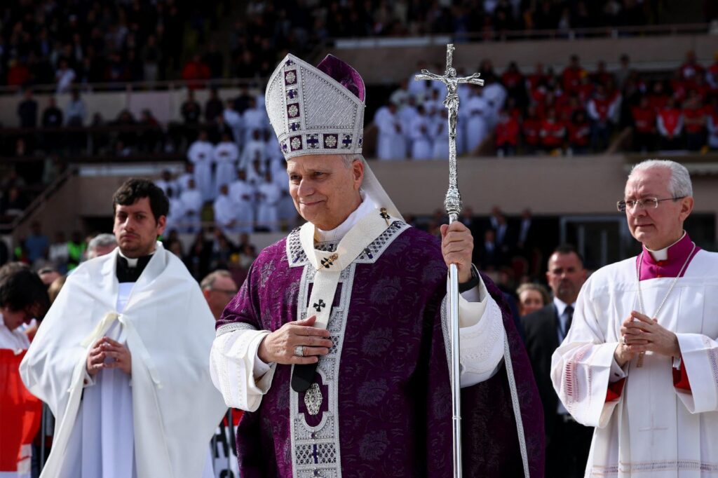 Pope Leo XIV celebrates Mass at Louis II Stadium March 28, 2026, in Monte Carlo, Monaco. The day trip marks the pope’s second apostolic journey and the first papal visit to the Catholic principality of Monaco in the modern era. (OSV News photo/Simone Risoluti, Vatican Media)