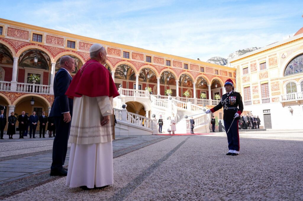 Pope Leo XIV reviews the honor guard during a welcome ceremony at the Prince’s Palace of Monaco in Monte Carlo, Monaco, March 28, 2026, during his second apostolic journey. The Prince’s Carabinieri Company was created in 1817. (CNS photo/Lola Gomez)