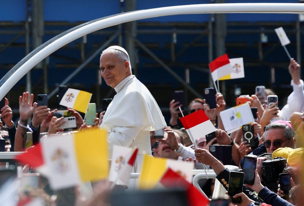Pope Leo XIV arrives at the Cathedral of the Immaculate Conception in Monaco March 28, 2026, to meet with the Catholic community. Built in a Romanesque-Byzantine style in the late 19th century, the cathedral can hold more than 1,000 people. (CNS photo/Lola Gomez)