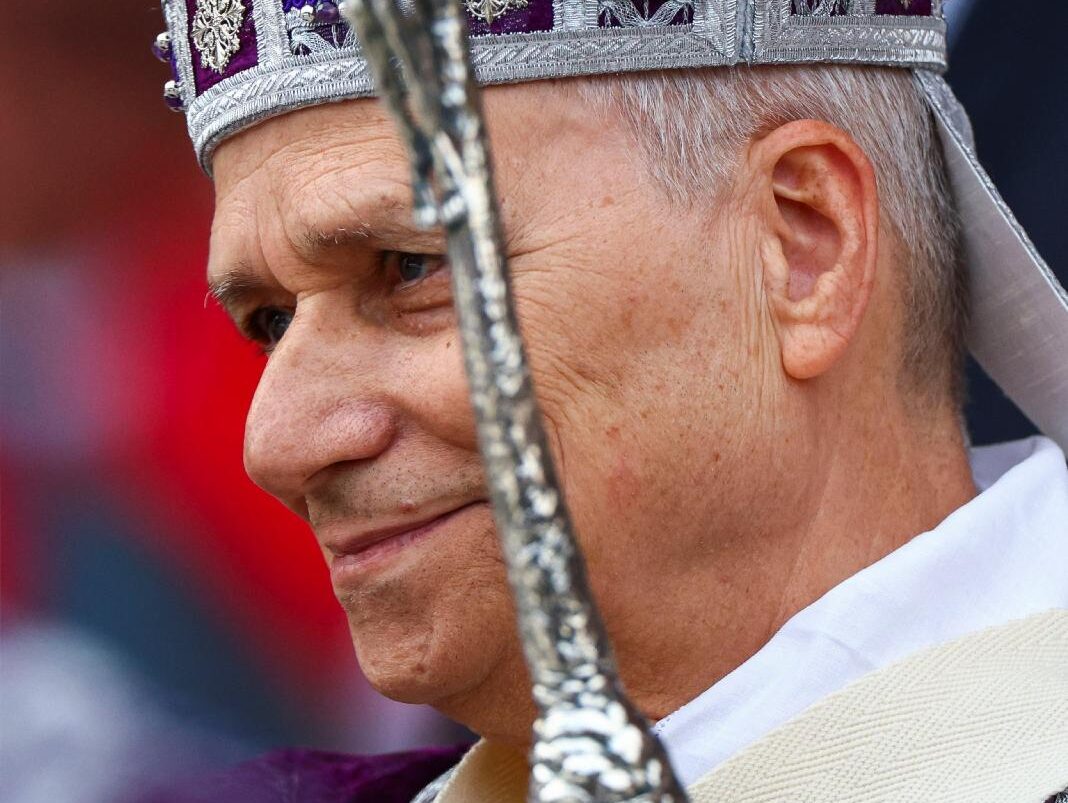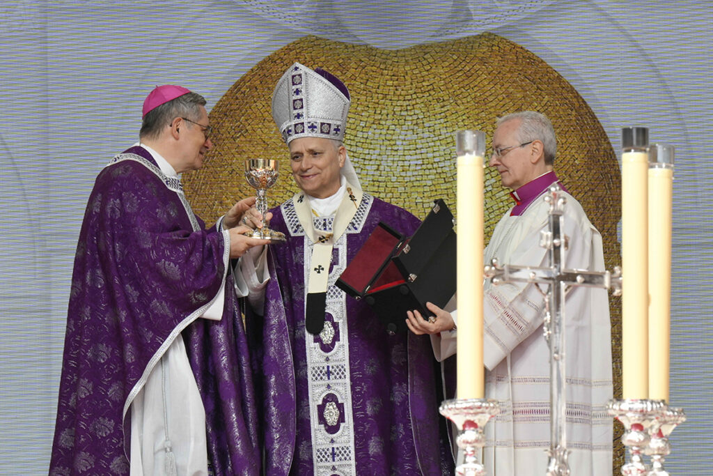 Pope Leo XIV presents Archbishop Dominique-Marie David of Monaco with a chalice after celebrating Mass at Louis II Stadium March 28, 2026, in Monte Carlo, Monaco. The day trip marks the pope’s second apostolic journey and the first papal visit to the Catholic principality of Monaco in the modern era. (OSV News photo/Elisabetta Trevisan, Vatican Media)