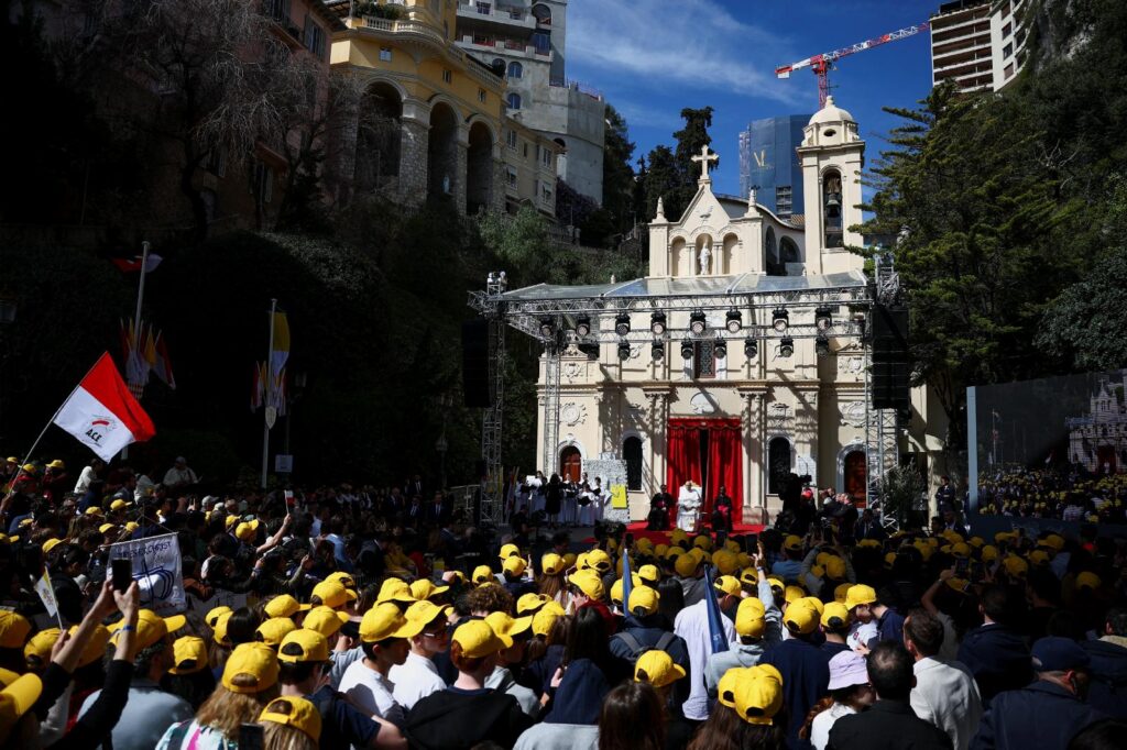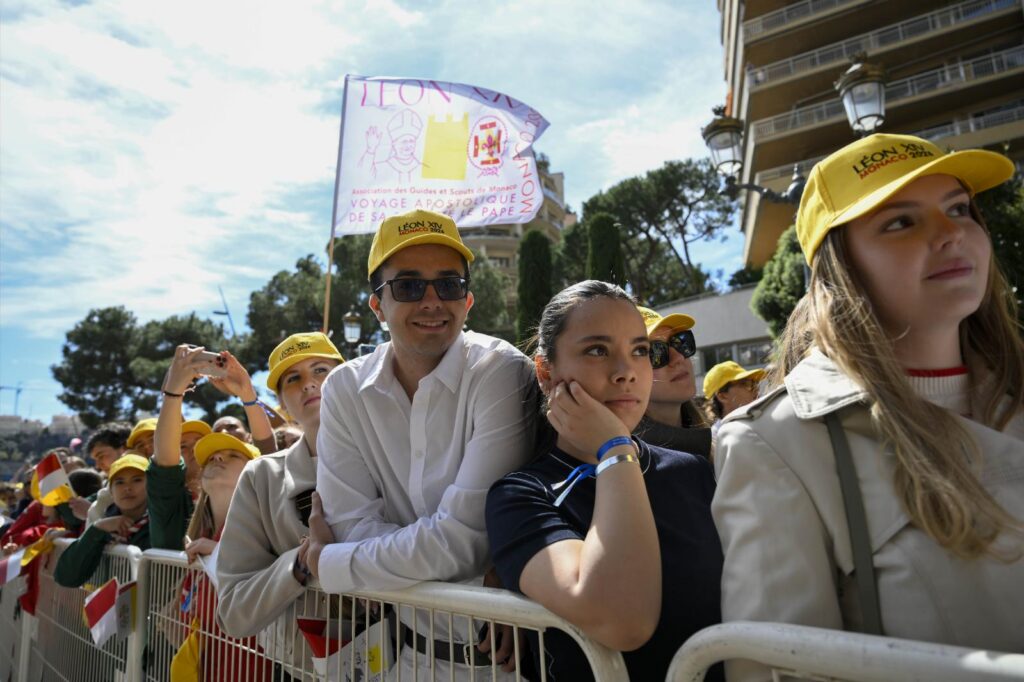 People look on as Pope Leo XIV leads a meeting with young people and catechumens outside the church of St. Devota, as part of a one-day apostolic trip in Monaco, March 28, 2026. It is Pope Leo’s first international journey of 2026 and only the second of his pontificate. (OSV News photo/Elisabetta Trevisan, Vatican Media)