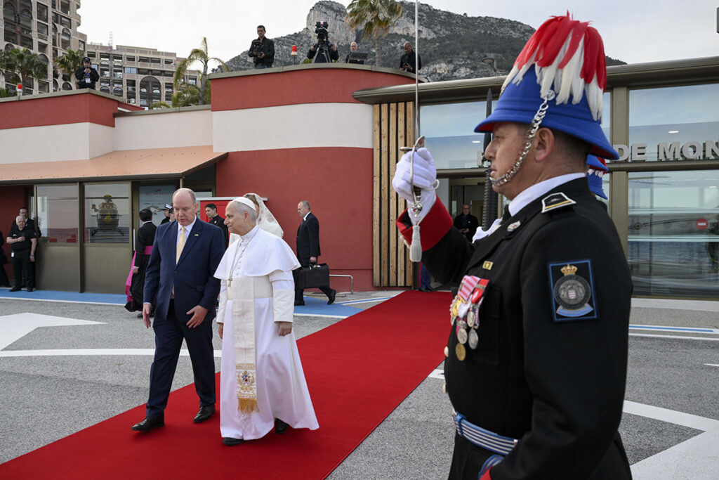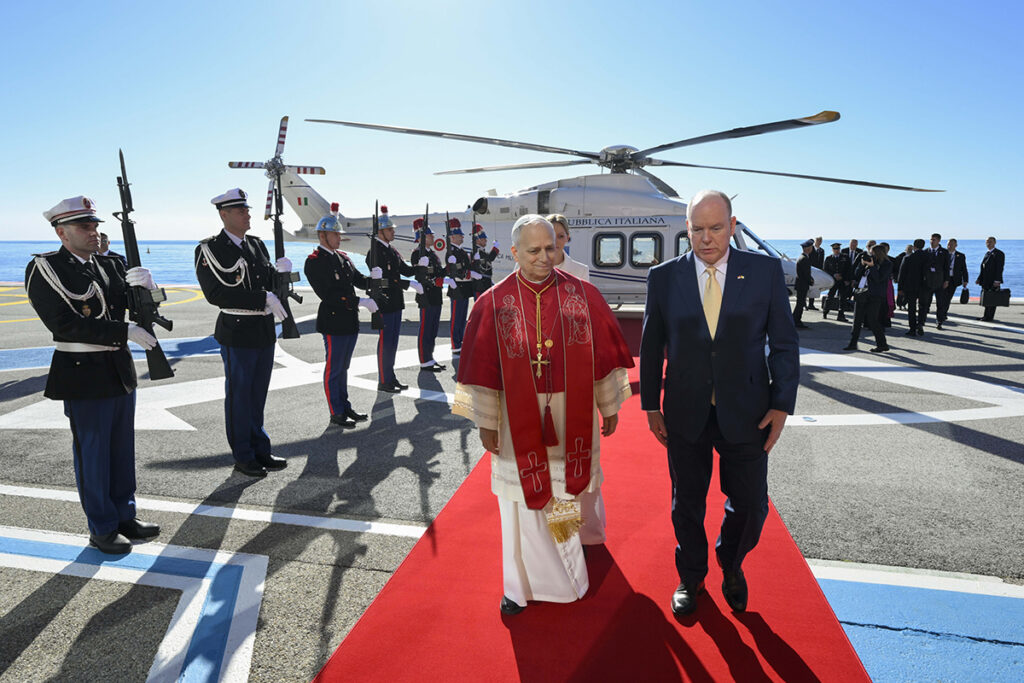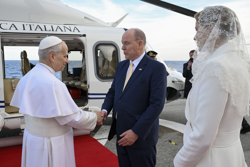 Prince Albert II of Monaco and Princess Charlene welcome Pope Leo XIV on the tarmac at Monaco heliport in Monaco March 28, 2026. It is Pope Leo’s first international journey of 2026 and only the second of his pontificate. (OSV News photo/Gregorio Borgia, Reuters)