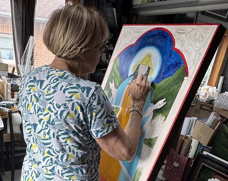 “Every time I come into my studio, I start with a prayer. I pray over my brushes. I pray over my paint. And, in the case of a saint, I pray to the saint,” she said. “I ask the saint to guide me to select the colors that the saint would want, to put the saint in a setting where the saint would want to be, and I ask the saint to speak to my heart, tell my heart what you want my hands to do.”