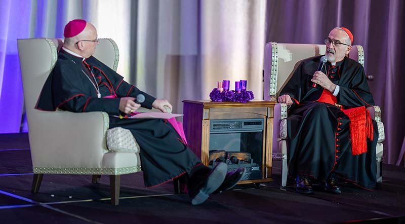 After dinner, emcee Chuck Gaidica, a former Detroit TV personality, hosted a fireside chat between Cardinal Pizzaballa and Archbishop Weisenburger took questions from the audience.