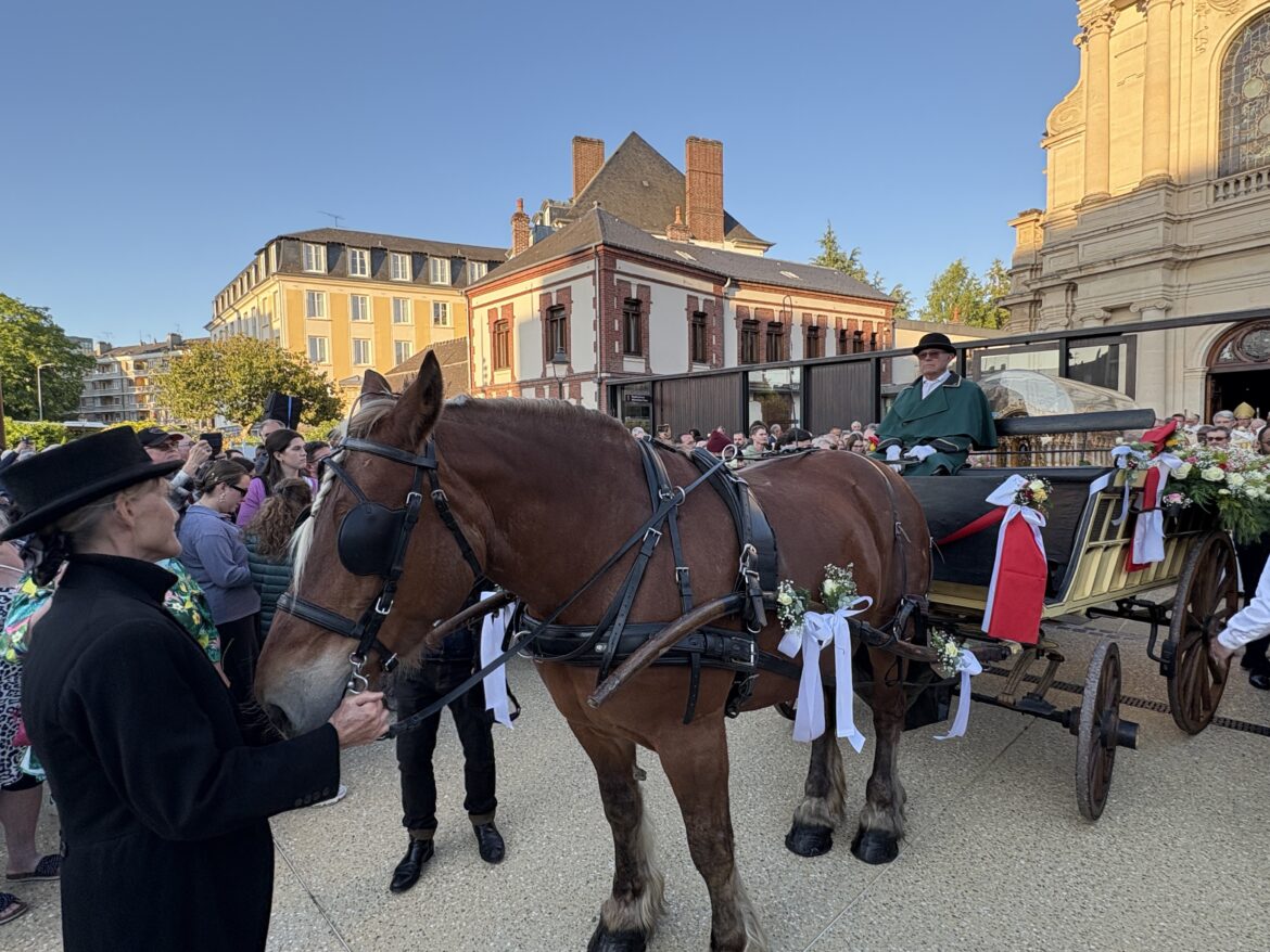 On May 16 in the evening — a procession carrying the relics of St. Thérèse on a horse-drawn cart traveled through the streets of Lisieux, followed by several hundred people.