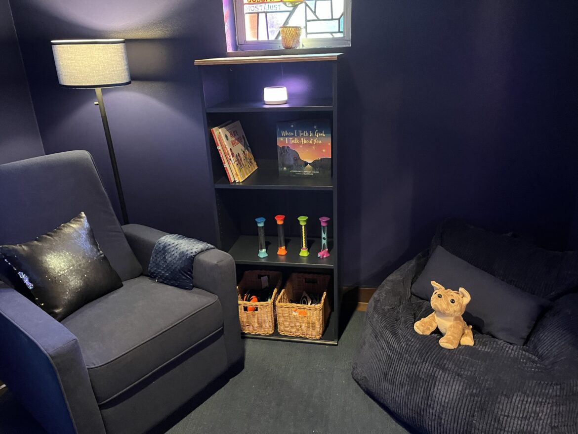 Creating the Still Waters room wasn’t easy, though. The space had served as a storage area since the COVID-19 pandemic, requiring Takacs’ team to clear four years’ worth of clutter. Then, they faced a unique challenge — designing a sensory-friendly room around the church’s vibrant stained-glass windows.