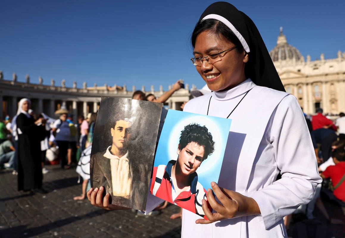 A nun holds a picture of Carlo Acutis and Pier Giorgio Frassati on the day Pope Leo XIV leads the canonization Mass of Blessed Carlo Acutis, a British-born Italian boy who will become the first millennial to be made a Catholic saint, and Blessed Pier Giorgio Frassati, in St. Peter's Square at the Vatican, Sept. 7, 2025. (OSV News photo/Matteo Minnella, Reuters)