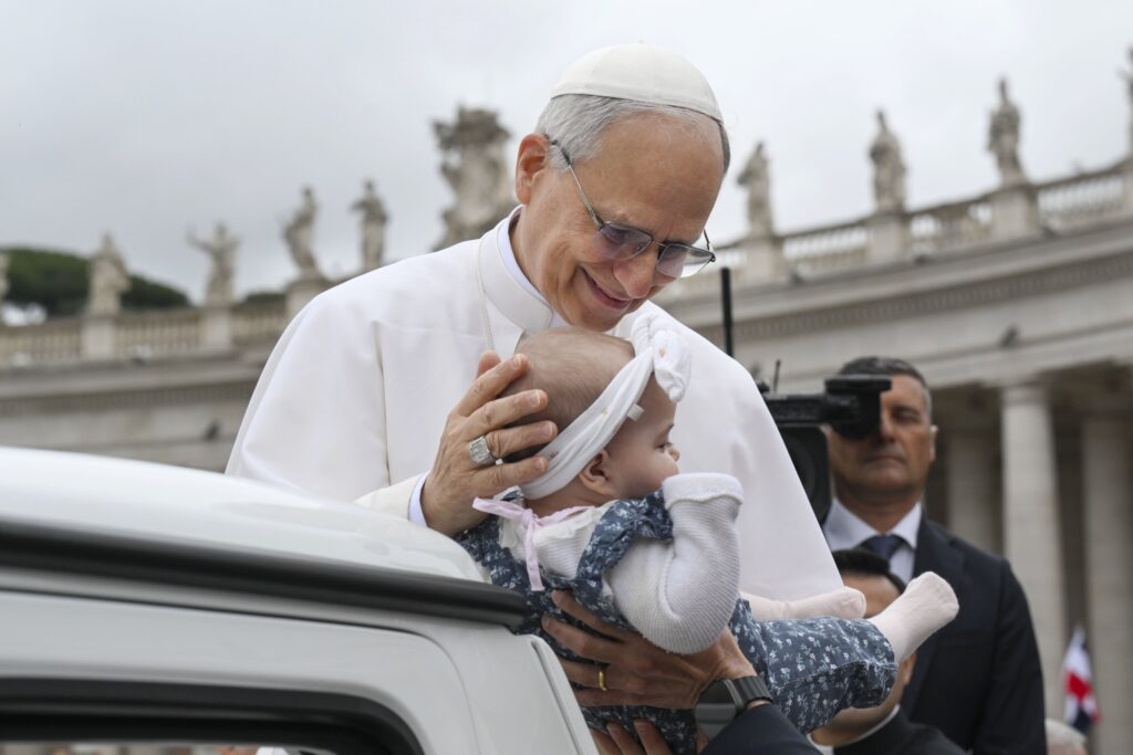 Pope Leo XIV blesses a baby as he rides in the popemobile around St. Peter’s Square at the Vatican before his first weekly general audience May 21, 2025. (CNS photo/Vatican Media)