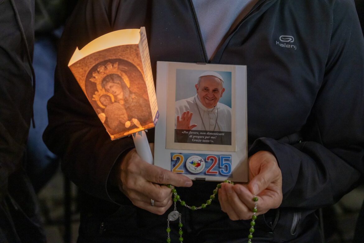 Heavy rains and a time change led to a smaller gathering of faithful in St. Peter’s Square on March 10 to pray for the pope’s recovery. The rosary, typically prayed in the late evening, was moved to 6 p.m. Rome time to coincide with the Curia’s spiritual exercises.