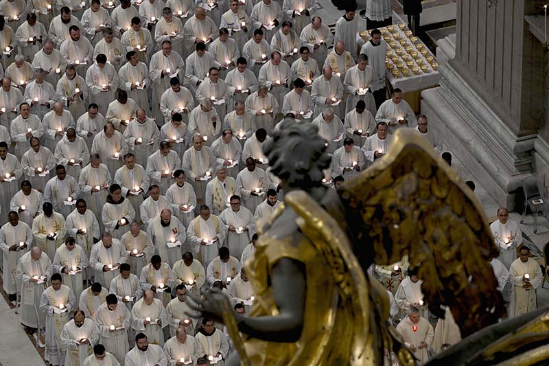 The pope’s Mass began with the pope blessing with holy water the candles used for the entrance procession. Dozens of consecrated men and women led the candlelit procession while the lights in St. Peter’s Basilica remained dimmed, and thousands of people who filled the basilica held lit candles as well.