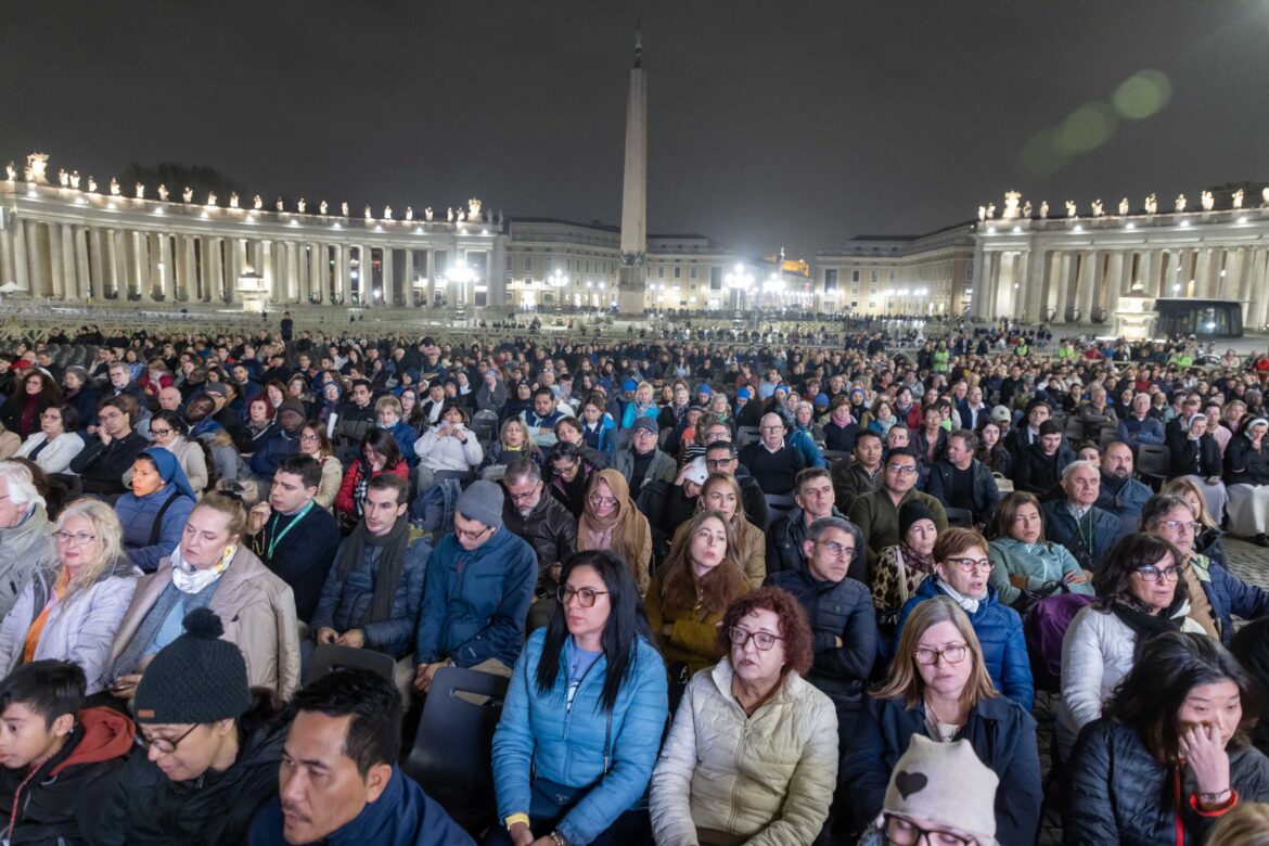 The recitation of the rosary for Pope Francis’ health continued in St. Peter’s Square March 15 despite light rain. Faithful gathered in the square were led in prayer by Archbishop Emilio Nappa, secretary-general of the Vatican City State government. Franciscan Sister of the Eucharist Raffaella Petrini, president of the governing office, introduced each of the joyful mysteries with a Gospel reading.