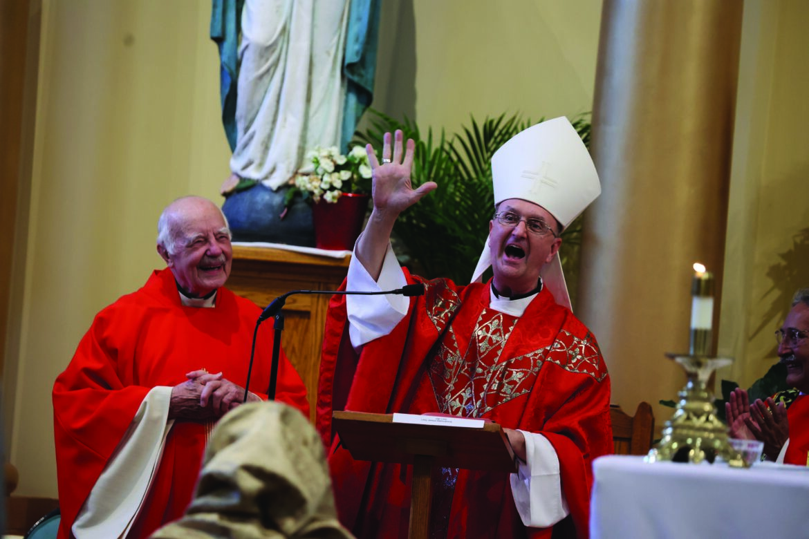 Bishop Lewandowski responded to those welcoming him from the pews with similar sign language and even used signs for five stars to give praise to Father Brice, in his eighth year of priestly ministry, and Msgr. Sabourin, who is celebrating his 65th anniversary of the priesthood this year.