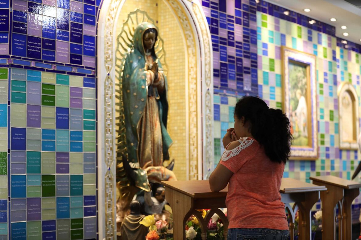 Suddenly, they make a sharp left turn, continuing in a tiny, determined line for several steps and then halting before another set of feet: those of Our Lady of Guadalupe, the patroness of unborn children whose serene countenance tenderly tilts to behold them, as water from an indoor fountain murmurs down the mosaic walls, and soft music envelops the space.