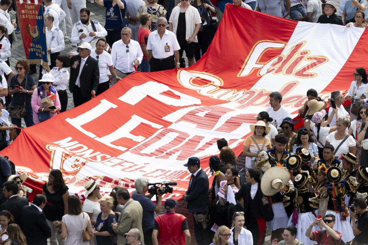 VATICAN CITY (CNS) — Dozens of small handmade signs and large bold banners waved in the crowd of some 30,000 visitors in St. Peter’s Square wishing Pope Leo XIV a happy birthday Sept. 14. Two gold mylar balloons with the numbers “7” and “0” were held up high.