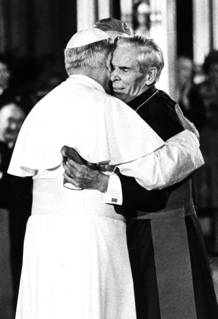 Two months before Archbishop Sheen died, St. John Paul II embraced him during a visit to St. Patrick’s Cathedral in New York City and said: “You have written and spoken well of the Lord Jesus. You are a loyal son of the Church.”